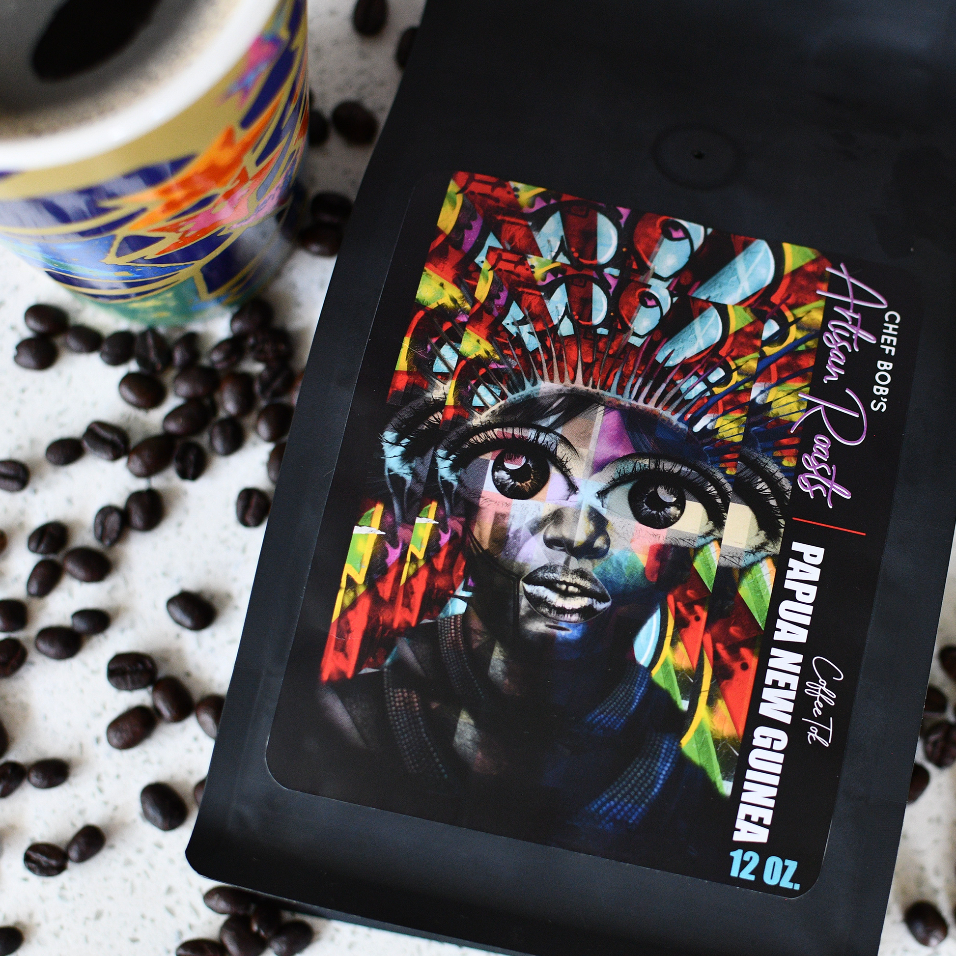Chef Bob's Artisan Roasts are coffee elevated to an art form. The beans are ethically sourced from premium growers from around the world and expertly roasted in Orlando, Florida. Each bag is labeled with its own piece of art, created by artist John Horrell. Chef Bob's Artisan Roasts are the coffee you "brew to woo"! Whole bean, 12 oz.